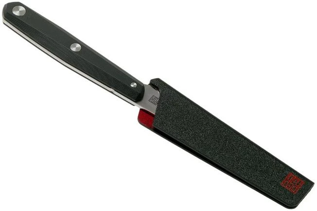 A lot smaller than the utility knife: the Real Steel OHK paring knife. Meant for the precise and more detailed cutting tasks. This knife is mostly used for smaller products and is perfect when trimming and cutting and for other detailed tasks in the kitchen. This knife comes with a plastic sheath, to safely store this stunning knife.